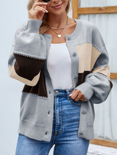 Roxana - Élégant cardigan boutonné à manches bouffantes et blocs de couleur