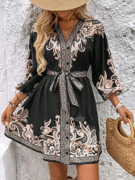 Lexi - Robe mini imprimée à manches courtes avec col en V profond et volants